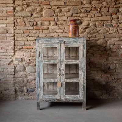 VETRINA CON DUE ANTE BIANCA E BLU IN LEGNO DI TEAK