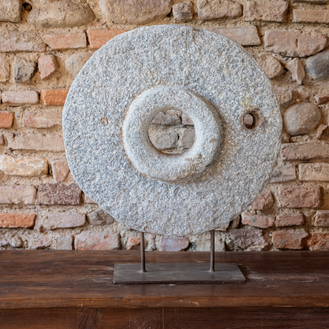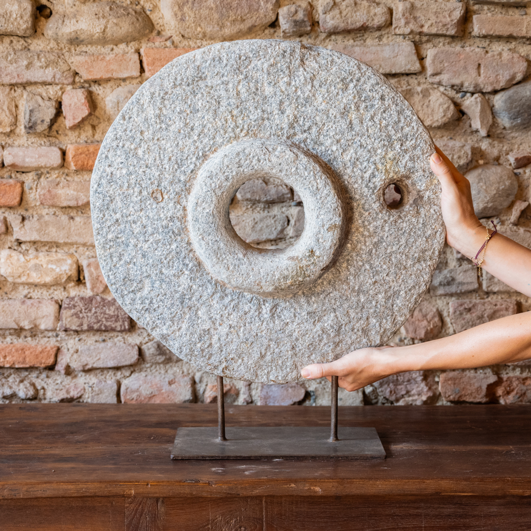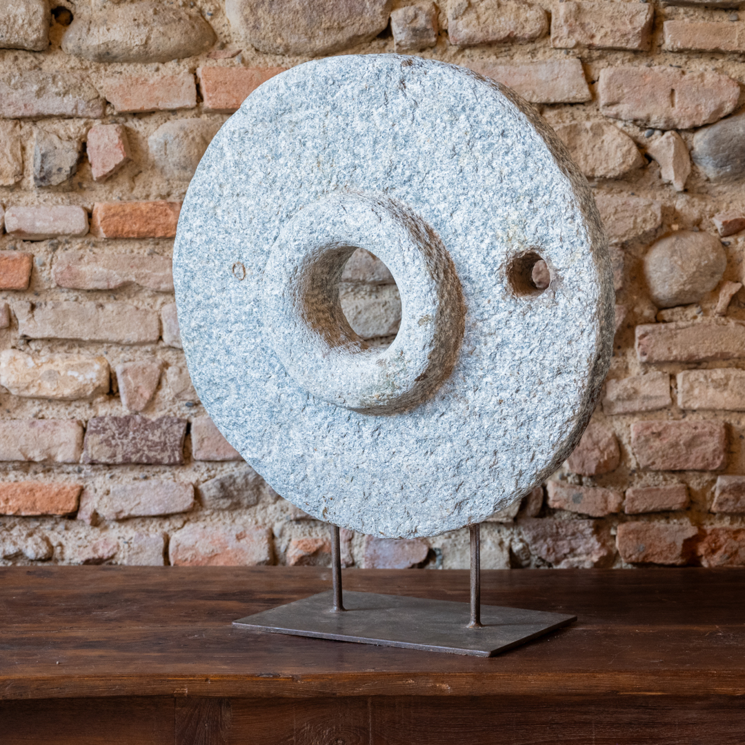 Ruota di macina in pietra con stand in ferro.
