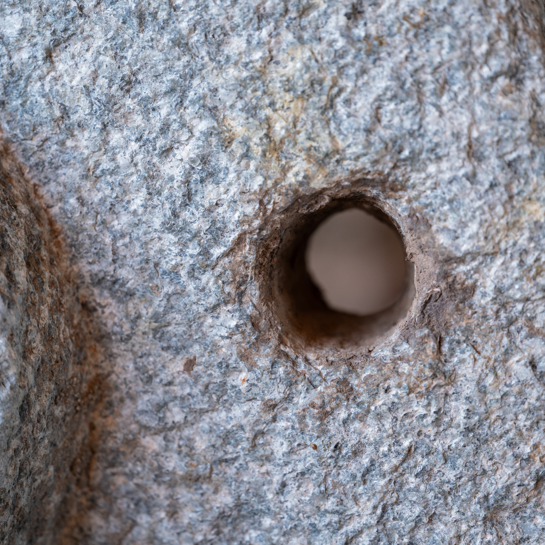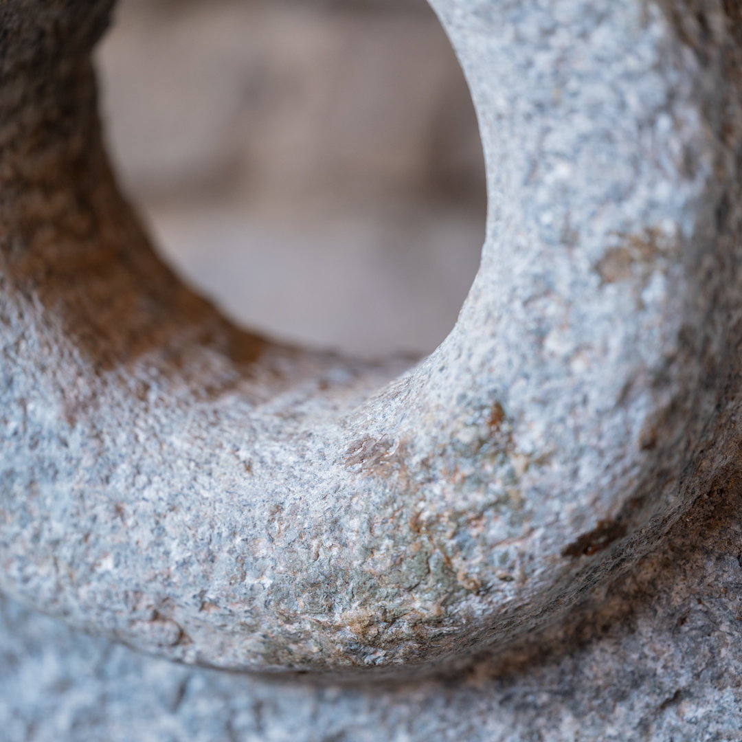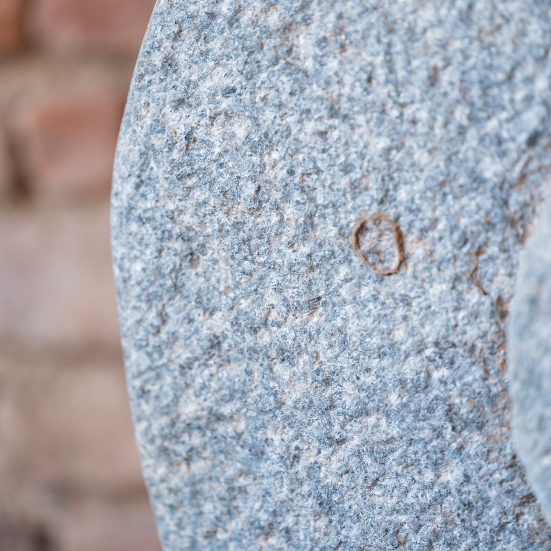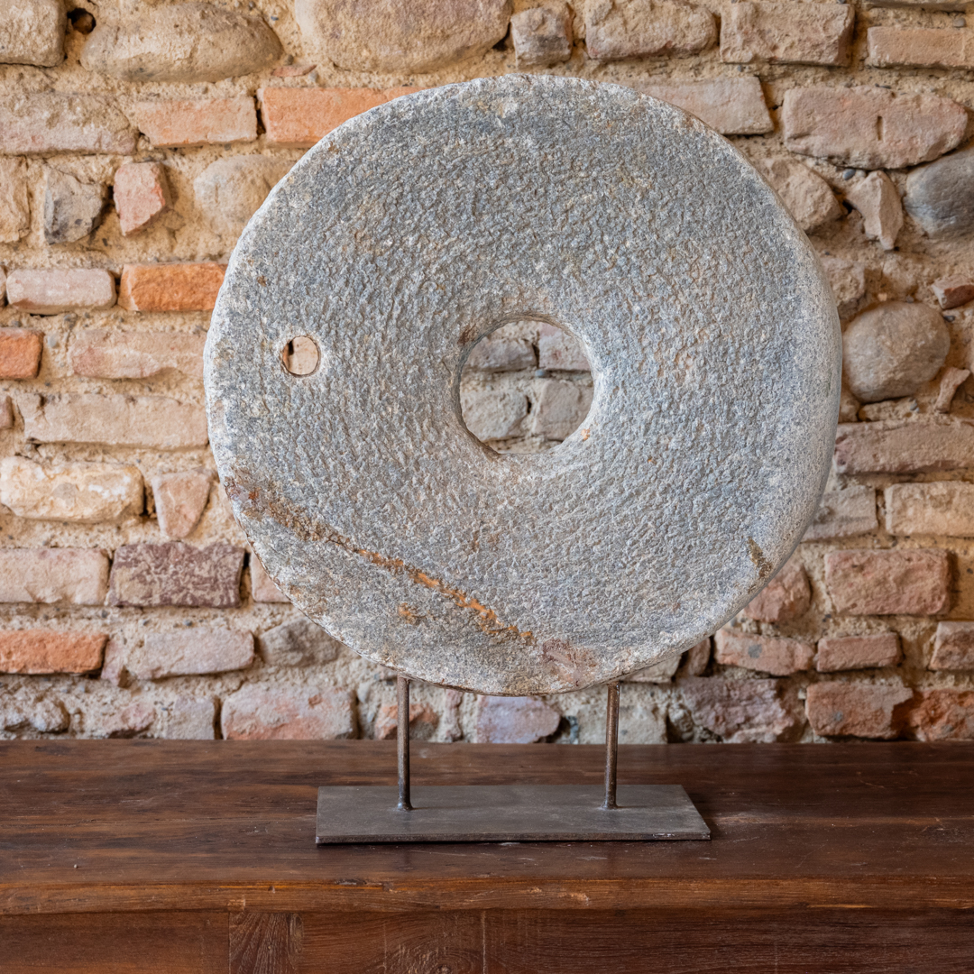 Ruota di macina in pietra con stand in ferro.